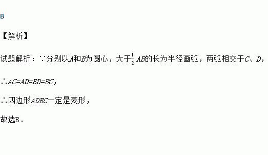 (题文)如图所示,小红在作线段AB的垂直平分线时,是这样操作的:分别以点A,B为圆心,大于线段AB长度的一半的长为半径画弧,相交于点C,D,则直线CD即为所求.连接AC,BC,AD,BD,根据她的作图方法可知四边形ADBC一定是 ( )