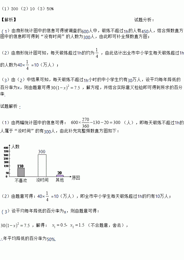 为了开展阳光体育运动,某市教体局做了一个随机调查,调查内容是:每天锻炼是否超过1h及锻炼未超过1h的原因.他们随机调查了600名学生,用所得的数据制成了扇形统计图和频数分布直方图(图1、图2).