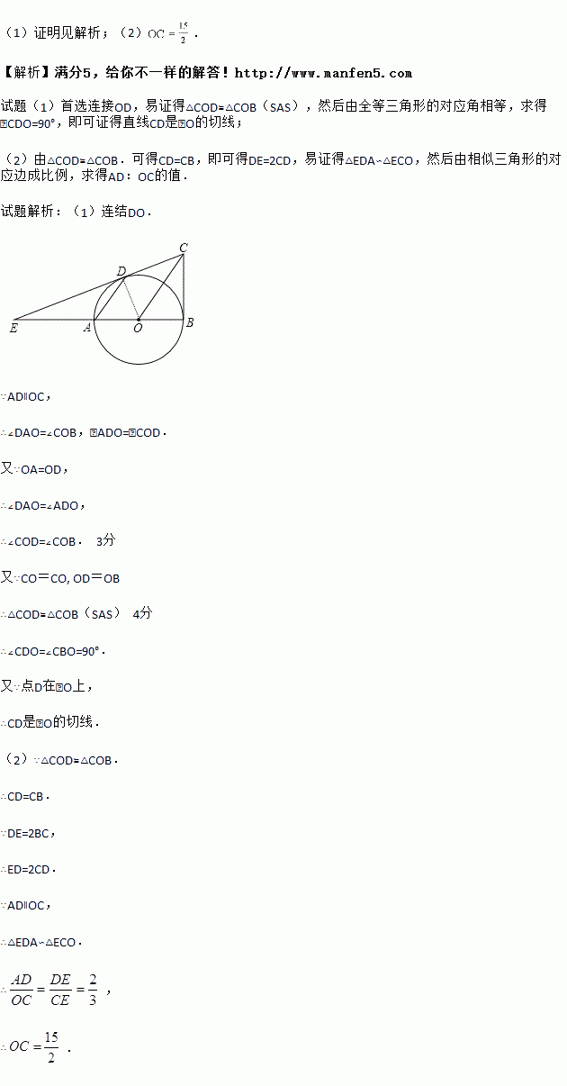 如图,已知AB是⊙O的直径,BC⊥AB,连结OC,弦AD∥OC,直线CD交BA的延长线于点E.