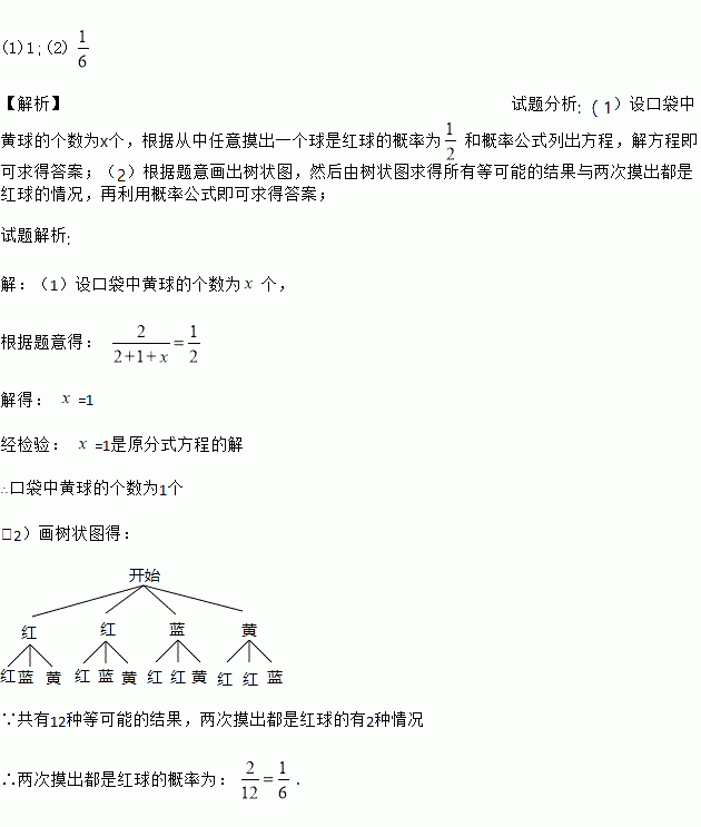 (1)1;(2) 【解析】试题分析: (1)设口袋中黄球的个数为x个,根据从中任意摸出一个球是红球的概率为和概率公式列出方程,解方程即可求得答案;(2)根据题意画出树状图,然后由树状图求得所有等可能的结果与两次摸出都是红球的情况,再利用概率公式即可求得答案; 试题解析: 【解析】 (1)设口袋中黄球的个数为个, 根据题意得: 解得: =1 经检验: =1是原分...