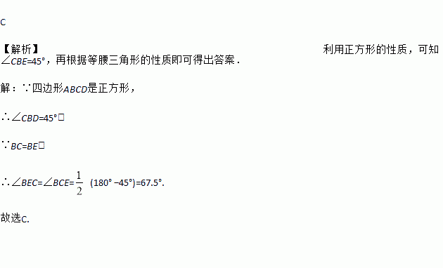 如图,正方形ABCD中,E是BD上一点,BE=BC,则∠BEC的度数是( )
