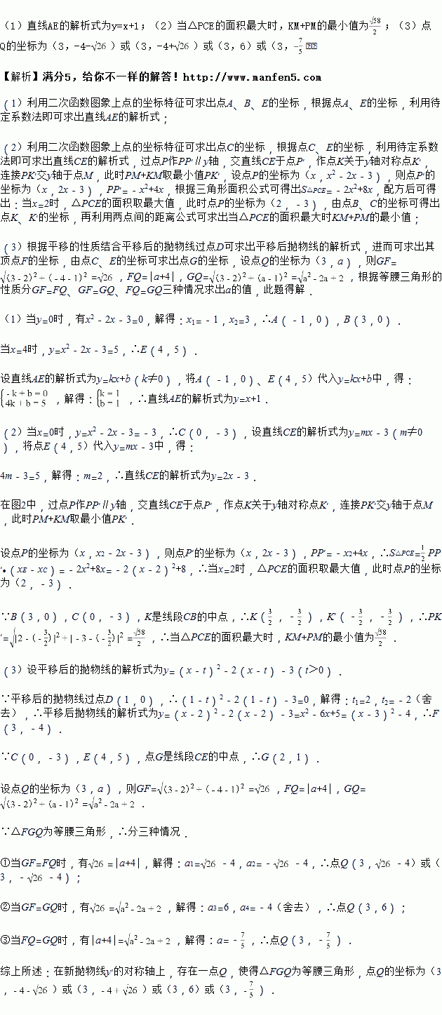 (3)点G是线段CE的中点,将抛物线y=x2﹣2x﹣3沿x轴正方向平移得到新抛物线y′,y′经过点D,y′的顶点为点F,在新抛物线y′的对称轴上,是否存在一点Q,使得△FGQ为等腰三角形?若存在,直接写出点Q的坐标;若不存在,请说明理由.