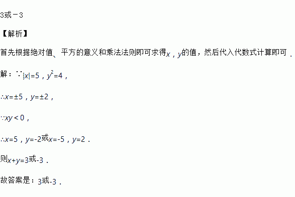 若|x|=5,y2=4,且xy<0,则x+y=________.