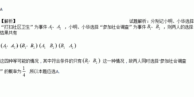 小明和小华参加社会实践活动,随机选择“打扫社区卫生”和“参加社会调查”其中一项,那么两人同时选择“参加社会调查”的概率为( )