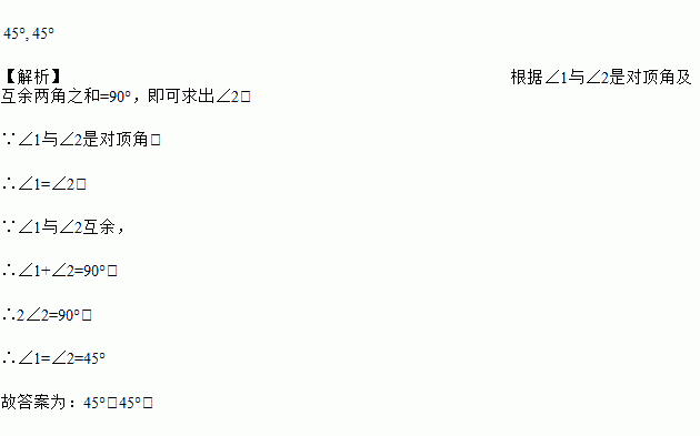 若∠1与∠2是对顶角,且∠1与∠2互余,则∠1=________,∠2=________.
