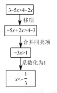 下边的框图表示解不等式3-5x>4-2x 的流程,其中“系数化为 ”这一步骤的依据是________________.