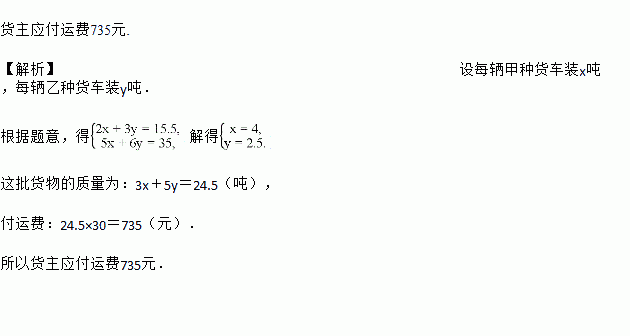 现租用该公司3辆甲种货车及5辆乙种货车一次刚好运完这批货,如果按每吨付运费30元计算,问货主应付运费多少元?