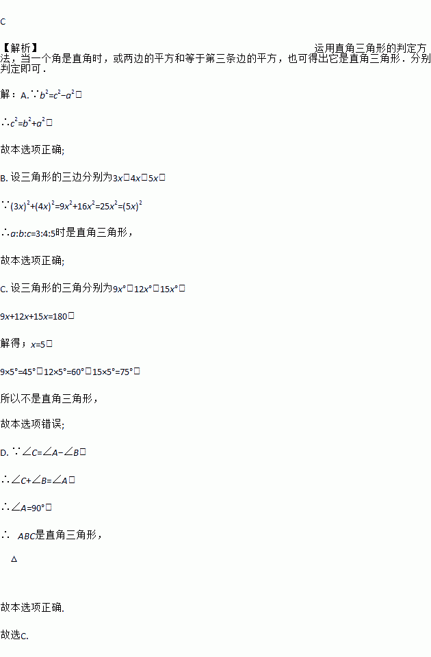 C. ∠A: ∠B: ∠C=9:12:15 D. ∠C=∠A-∠B