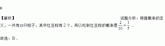 端午节吃粽子是中华民族的传统习俗,妈妈买了2只红豆粽、3只碱水粽、5只干肉粽,粽子除内部馅料不同外其它均相同,小颖随意吃一个,吃到红豆粽的概率是( )