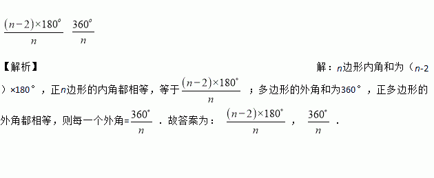 【解析】【解析】 n边形内角和为(n-2)×180°,正n边形的内角都相等,等于 ;多边形的外角和为360°,正多边形的外角都相等,则每一个外角=.故答案为: , .