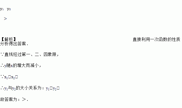 已知点A(x1, y1)、B(x2, y2)在直线y=kx+b上,且直线经过第一、二、四象限,当x1<x2时,y1与y2的大小关系为________.