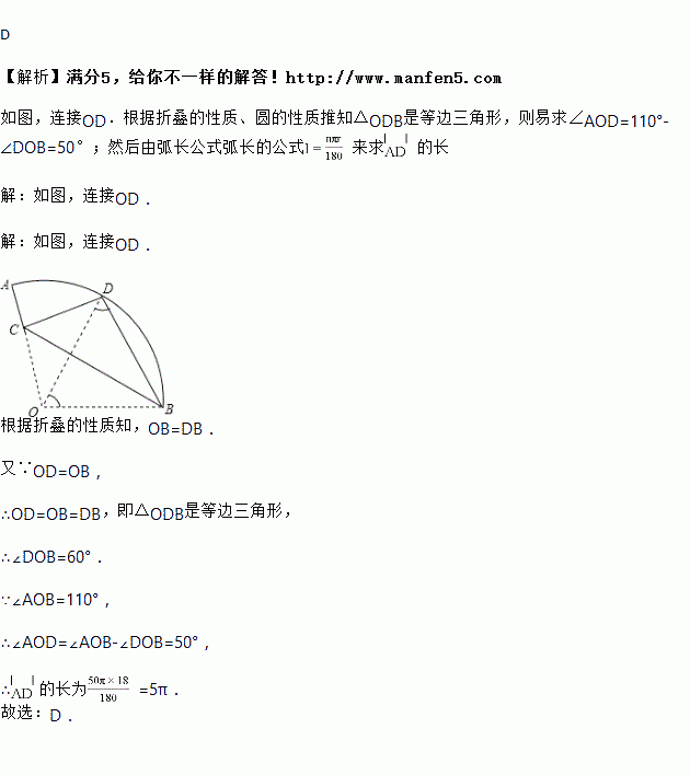 已知:如图,在扇形OAB中,∠AOB=110°,半径OA=18,将扇形OAB沿过点B的直线折叠,点O恰好落在弧AB上的点D处,折痕交OA于点C,则弧AD的长为( )