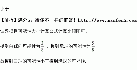 一个口袋中装有5个红球,3个白球,1个绿球,摸到白球的可能性______摸到绿球的可能性(填“大于”“小于”或“等于”)