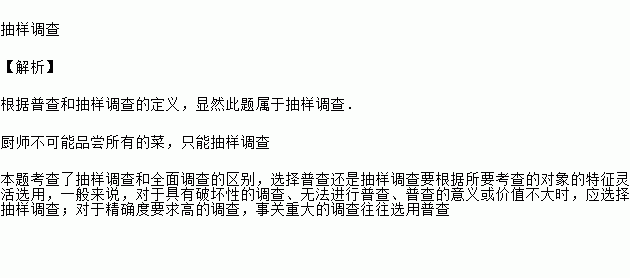 妈妈做了一份美味可口的菜品,为了了解菜品的咸淡是否适合,于是妈妈取了一点品尝,这应该属于________ .(填普查或抽样调查)