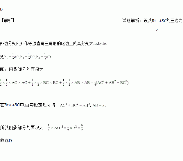 已知:如图,以Rt△ABC的三边为斜边分别向外作等腰直角三角形,若斜边AB=3,则图中阴影部分的面积为( )
