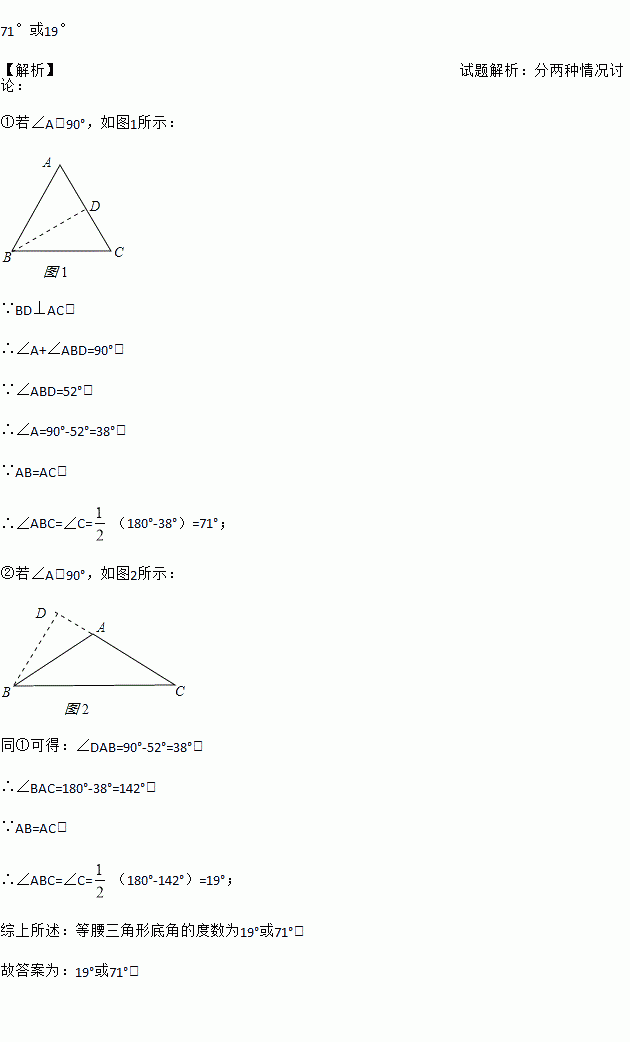 71°或19° 【解析】试题解析:分两种情况讨论: ①若∠A<90°,如图1所示: ∵BD⊥AC, ∴∠A+∠ABD=90°, ∵∠ABD=52°, ∴∠A=90°-52°=38°, ∵AB=AC, ∴∠ABC=∠C=(180°-38°)=71°; ②若∠A>90°,如图2所示: 同①可得:∠DAB=90°-52°=38°, ∴∠B...