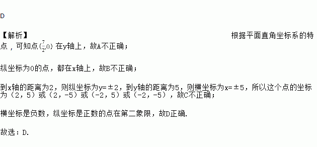 C. 已知一点到x轴的距离为2,到y轴的距离为5,则这个点的坐标为(5,2) D. 横坐标是负数,纵坐标是正数的点在第二象限