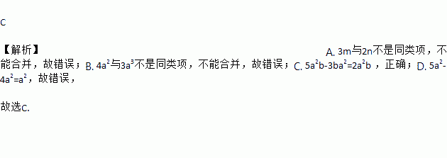 C 【解析】A. 3m与2n不是同类项,不能合并,故错误;B. 4a2与3a3不是同类项,不能合并,故错误;C. 5a2b-3ba2=2a2b ,正确;D. 5a2-4a2=a2,故错误, 故选C.