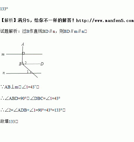 如图,m∥n,AB⊥m,∠1=,则∠2=_______