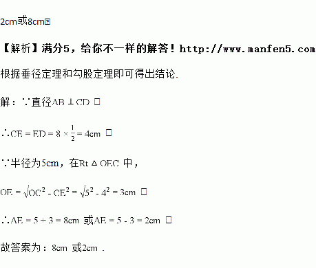 在半径为5cm的⊙O中,如果弦CD=8cm,直径AB⊥CD,垂足为E,则AE的长为_____cm.