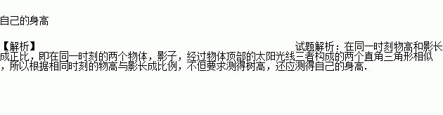 上小学五年级的小丽看见上初中的哥哥小勇用测树的影长和自己影长的方法来测树高,她也学着哥哥的样子在同一时刻测得树的影长为5米,自己的影长为1米.要求得树高,还应测得______________.