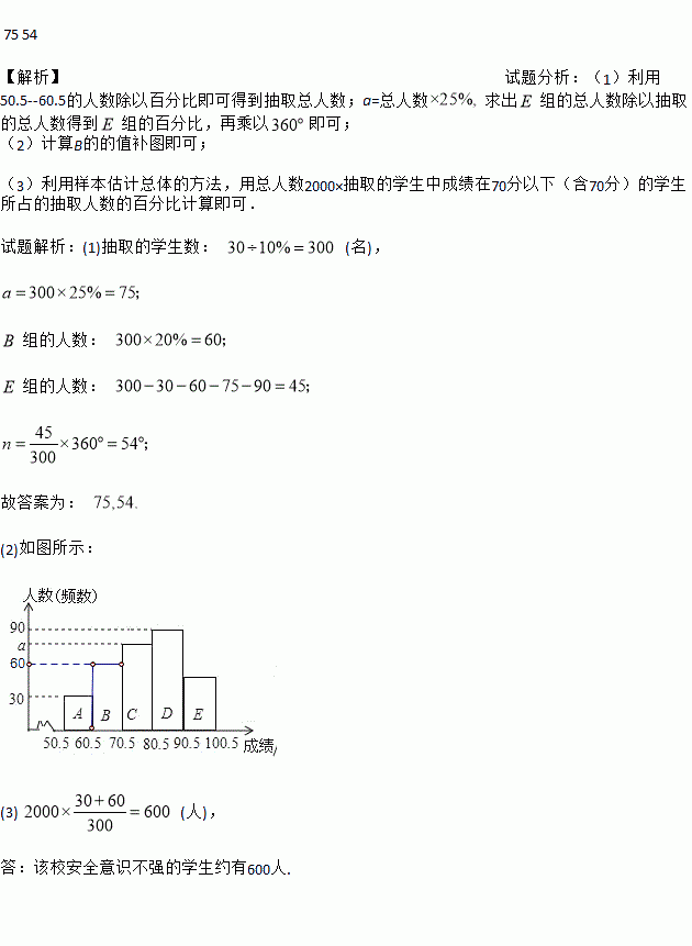 (3)该校共有2000名学生.若成绩在70分以下(含70分)的学生安全意识不强,有待进一步加强安全教育,则该校安全意识不强的学生约有多少人?
