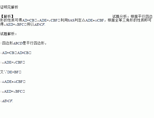 如图,在口ABCD中,点E、F是对角线BD上的两点,且BF=DE,连接AE、CF.