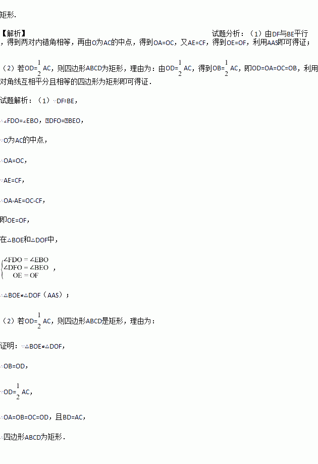 如图,四边形ABCD的对角线AC、BD交于点O,已知O是AC的中点,AE=CF,DF∥BE.