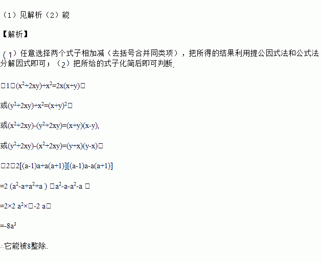 (1)在三个整式x2+2xy,y2+2xy,x2中,请你任意选出两个进行加(或减)运算,使所得整式可以因式分解,并将其进行因式分解;