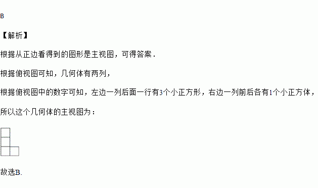 由5块完全相同的小正方体所搭成的几何体从上面看到的平面图如图所示,小正方形中的数字表示在该位置小正方体的个数,则从正面看到的平面图形是( )
