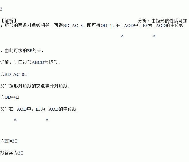 如图,矩形ABCD中,对角线AC、BD相交于点O,点E、F分别是AO、AD的中点,若AC=8,则EF=_________________.