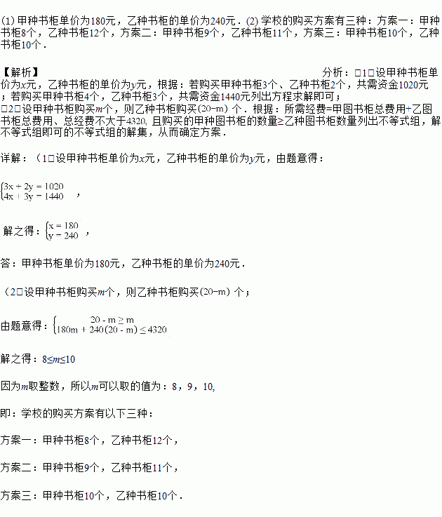 (2)若该校计划购进这两种规格的书柜共20个,其中乙种书柜的数量不少于甲种书柜的数量,学校至多能够提供资金4320元,请设计几种购买方案供这个学校选择.