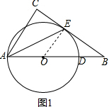 分析 (1)如图1,连接OE由BC与⊙O相切,得到OE⊥BC,由于AO=OD=DB,推出∠B=$\frac{1}{2}∠$BOE=30°,根据同圆的半径相等得到OA=OE,于是∠BAE=∠AEO=30°,进而求得结果cos∠CAE=$\frac{\sqrt{3}}{2}$;