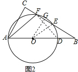 (2)如图2,连接DF,OE,由垂径定理得到∴OE⊥DF,由AD是⊙O的直径,得到∠AFD=90°,根据平行线分线段成比例得到$\frac{OE}{AF}=\frac{OB}{AB}=\frac{BE}{BF}=\frac{2}{3}$,过O作OG⊥BC,同理可得$\frac{OG}{AC}=\frac{BO}{AB}=\frac{BG}{BC}=\frac{2}{3}$,于是得到结果