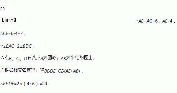 如图,在△ABC中,AB=AC=6,∠A=2∠BDC, BD交AC边于点E,且AE=4,则BE·DE=____________.