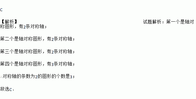 C 【解析】试题解析:第一个是轴对称图形,有2条对称轴; 第二个是轴对称图形,有2条对称轴; 第三个是轴对称图形,有2条对称轴; 第四个是轴对称图形,有3条对称轴; ∴对称轴的条数为2的图形的个数是3; 故选C.下列说法正确的是( )