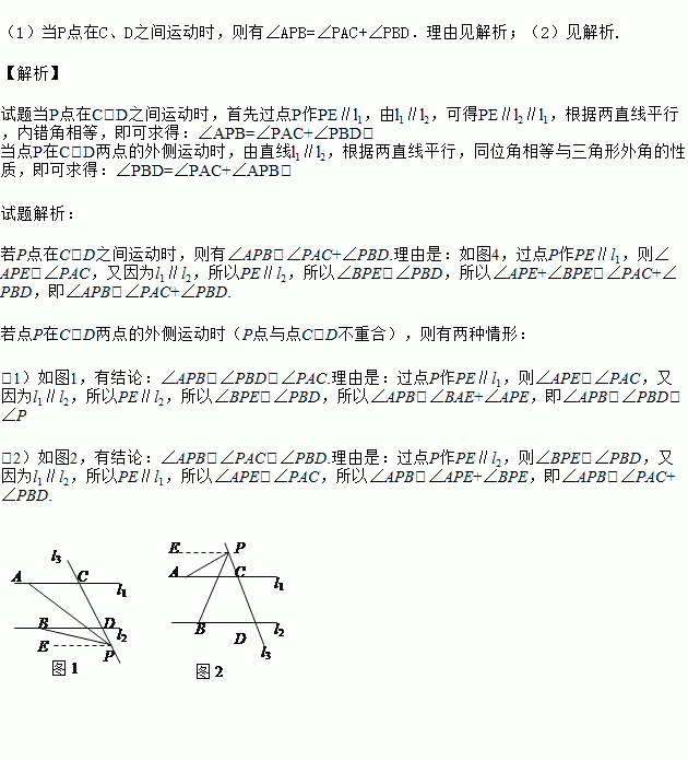 (2)若点P在C、D两点的外侧运动时(P点与点C、D不重合),试探索∠PAC,∠APB,∠PBD之间的关系又是如何?