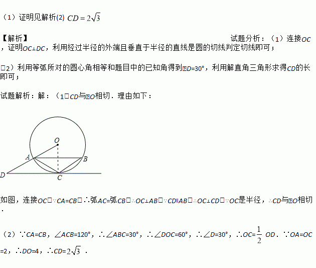 (2)若∠ACB=120°,OA=2,求CD的长.