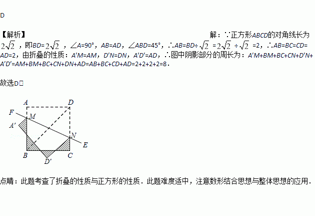 如图,已知正方形ABCD的对角线长为2,将正方形ABCD沿直线EF折叠,则图中阴影部分的周长为( )