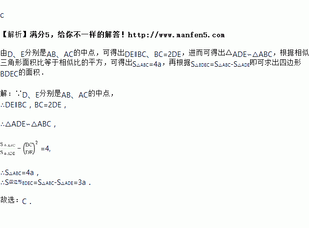 如图,在△ABC中,D、E分别是AB、AC的中点,若△ADE的面积是a,则四边形BDEC的面积是( )