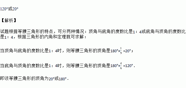 已知一个等腰三角形两内角的度数之比为1∶4,则这个等腰三角形顶角的度数为_______.