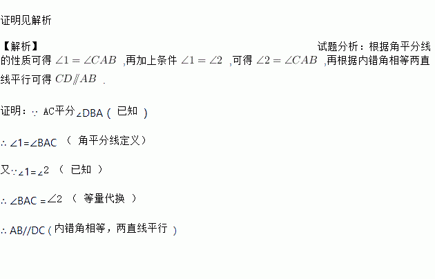 如图,已知∠1=∠2,AC平分∠DAB,试说明AB//DC;