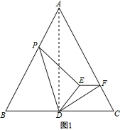 分析 (1)如图1,连接AD,由△ABC是等边三角形,得到∠B=∠C=60°,∠DAC=$\frac{1}{2}$∠BAC=30°,根据已知条件得到$\frac{PD}{DE}=\frac{AD}{DF}$=2,推出△APD∽△EDF,根据相似三角形的性质即可得到结论;