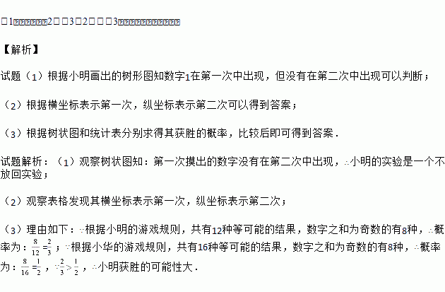 (3)规定两次抽到的数字之和为奇数的获胜,你认为谁获胜的可能性大?为什么?