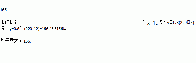 经测量,人在运动时所能承受的每分钟心跳的最高次数通常和人的年龄有关.如果用x表示一个人的年龄,用y表示正常情况下这个人在运动时所能承受的每分钟心跳的最高次数,那么y=0.8(220-x).今年上七年级的小虎12岁,据此表达式计算,他运动时所能承受的每分钟的最高心跳次数约是________(取整数).