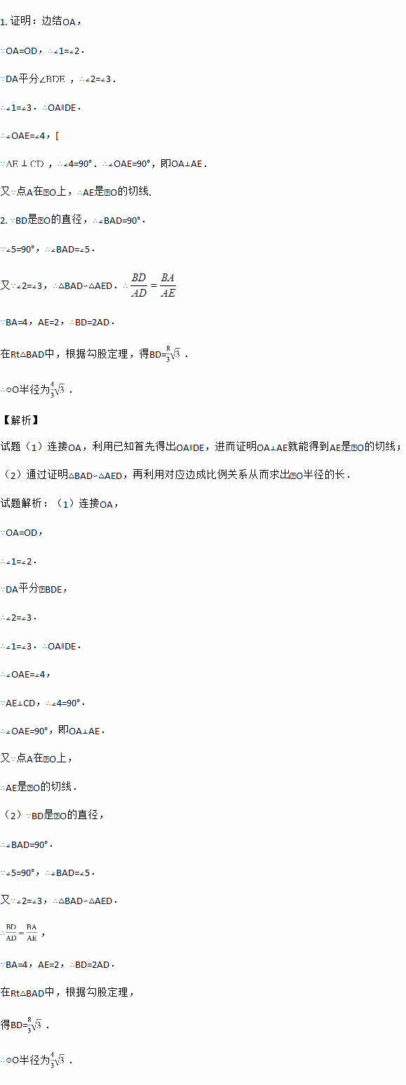 (1)求证:AE是⊙O的切线;