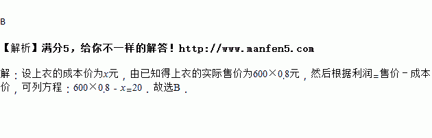 某商场销售的一件衣服标价为元,商场在开展促销活动中,该件衣服按折销售仍可获利元.设这件衣服的进价为元,根据题意,下面所列方程正确的是( )