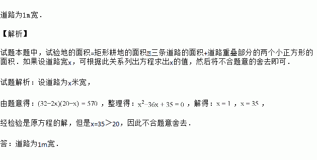 如图所示,在长为32m、宽20m的矩形耕地上,修筑同样宽的三条道路(两条纵向,一条横向,横向与纵向互相垂直),把耕地分成大小不等的六块作试验田,要使试验田面积为570m2,问道路应多宽?