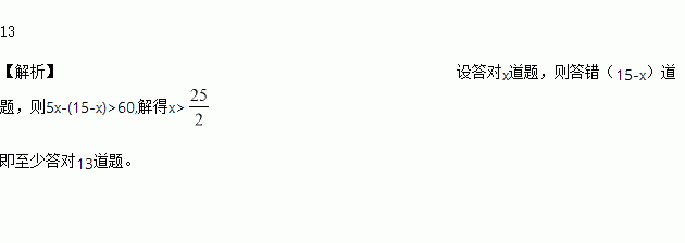 某次数学测验中共有16道题目,评分办法:答对一道得5分,答错或不答一道扣1分,某学生有一道题未答,那么这个同学至少要答对________道题,成绩才能在60分以上.