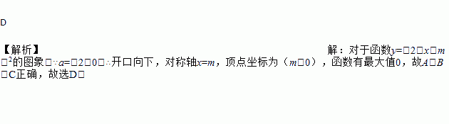 D 【解析】【解析】 对于函数y=﹣2(x﹣m)2的图象,∵a=﹣2<0,∴开口向下,对称轴x=m,顶点坐标为(m,0),函数有最大值0,故A、B、C正确,故选D.